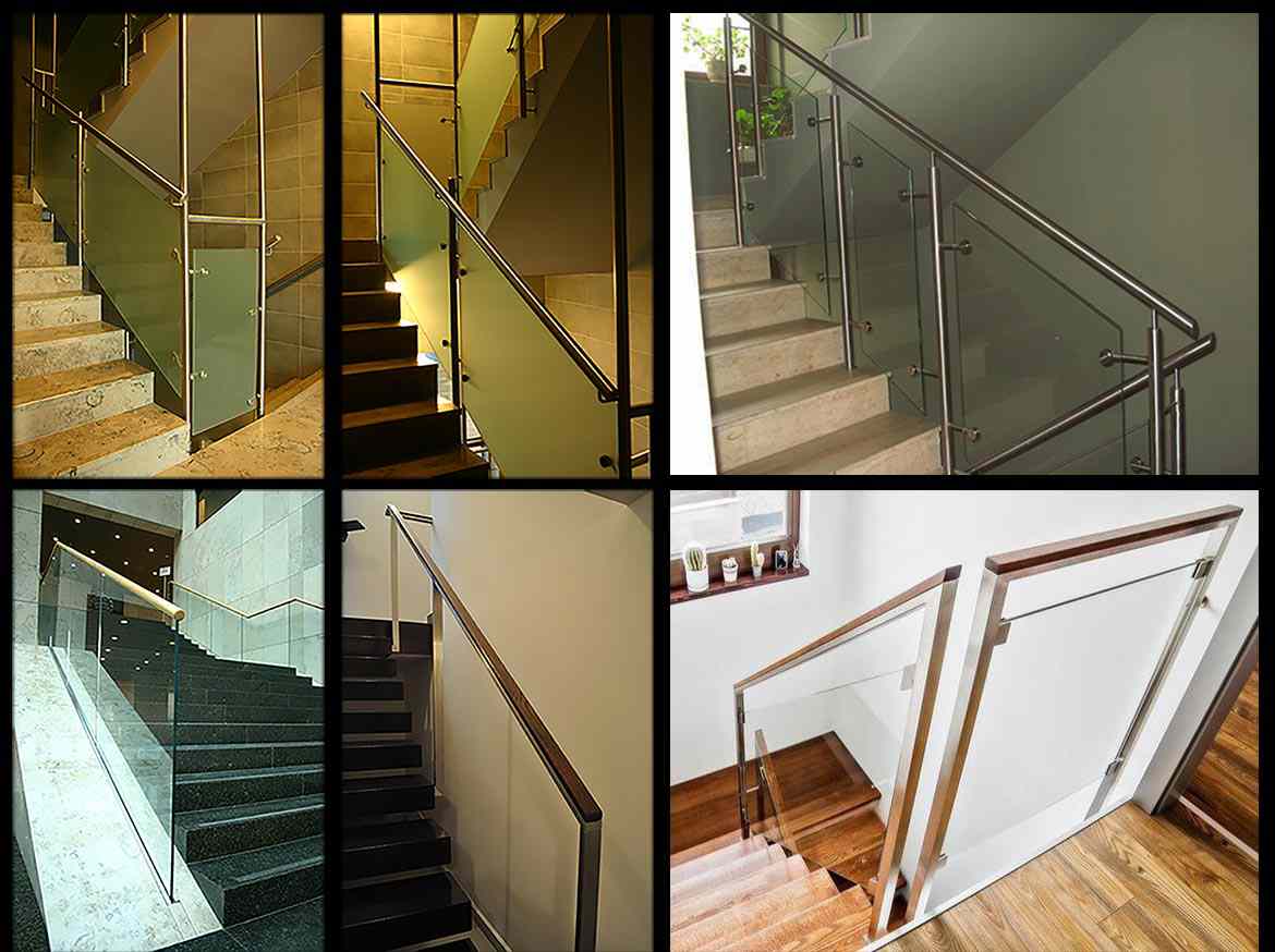 Løsninger præsenteret er af stolpefrit glasgelænder sammen med et andet materiale, såsom stål, aluminium eller træ, til håndlister.